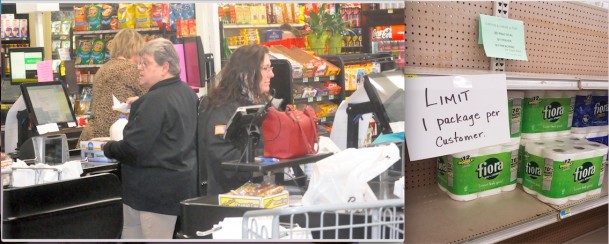 At left, Brother's has been one of the busiest spots in Grundy Center over the last week. At right, toilet paper has been hard to find at places like Trunck's in Reinbeck. (Left photo by Robert Maharry/Right photo courtesy of Sue Trunck)